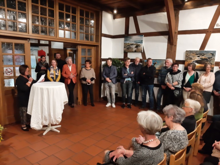 An diesem Abend - während der Eröffnungsrede – verabschiedete sich die bisherige Vorsitzende der Aquarelly`s Madame Josette Belot und stellte ihre Nachfolgerin und damit die neue Vorsitzende Madame Chantal Bouillet vor. Am Samstagvormittag stand ein Ausflug nach Osnabrück an. Mit den französischen Gästen wurde das Rathaus, ein Teil der Altstadt inkl. Dom besichtigt. Auch war Zeit zum Shoppen und für einen Imbiss. Abends traf man sich zu einem großen gemeinsamen Essen. Der Ausflug am Sonntagvormittag ging nach Altenberge. Dort wurde der 1860 von einer Brauerei gegründete Eiskeller besichtigt. Er befindet sich 14 Meter unter der Erde und hat diverse Großgewölbe. Anschließend ging die Fahrt zu Holtkamps Deele, wo gemeinsam Mittag gegessen wurde. An beiden Tagen war die Ausstellung gut besucht. Nicht zuletzt lockte außer der Kunst auch das große Buffet mit selbstgebackenem Kuchen die Besucher ins Haus Hehwerth. Am späten Sonntagnachmittag haben wir unsere Freunde und Gäste aus Lyz und Köln verabschiedet. Nicht ohne zu versprechen, uns im nächsten Jahr in Frankreich zur Ausstellung wiederzutreffen.